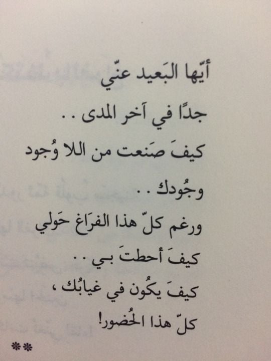حبيب ليس يعدله حبيبوما لسواه في قلبي نصيبحبيب غاب عن بصري وشخصيولكن عن فؤادي لا يغيبيا غائباً عن عيوني وأنت ماء السّوادما أنت إلا شجوني وذكريات الودادوما أنت إلا رجائي وبلسمي عند دائييا طائراً في سمائي وسائراً في وِهادي