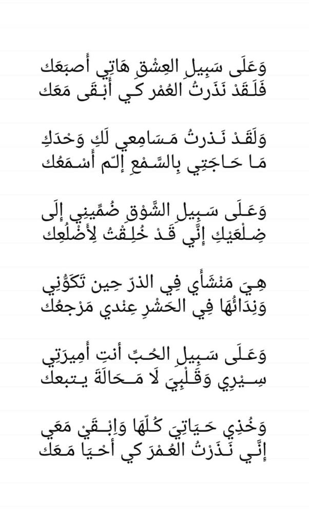 ربما عجزت روحي ان تلقاكيوعجزت عيني ان تراكي ولكن لم يعجز قلبي ان ينساكي.اذا العين لم تراكي فالقلب لن ينساكي .احبك موت…. لا تسأليني ما الدليلارايت رصاصه تسأل القتيل .ربما يبيع الانسان شيئا قد شراهلكن لا يبيع قلباً قد هواه .