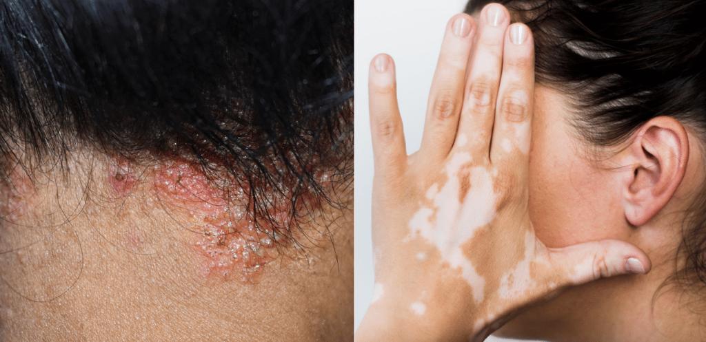 - البهاق: (بالإنجليزية: Vitiligo)، تظهر لدى الأشخاص الذين يُعانون من مشكلة البهاق بقع بيضاء في المناطق التي حدث فيها تلف للخلايا التي تصنع صبغة الجلد، وتجدر الإشارة إلى أنّ الباحثين غير متأكدين تماماً من العامل المُسبب لحدوث مشكلة البهاق، لكنّهم يعتقدون بأنّها مشكلة مناعيةّ؛ إذ يقوم جهاز المناعة بإلحاق الضرر بالخلايا الصحية عن طريق الخطأ، ويُعدّ البهاق من الاضطرابات غير المعدية، ومما ينبغي التنويه إليه عدم إمكانية علاج البهاق، ولكن هناك العديد من العلاجات التي يتمّ استخدامها لمحاولة استعادة التصبغ المفقود في البشرة، وتجدر الإشارة إلى أنّ البقع البيضاء التي تظهر عند الماصبين بالبهاق تظهر عادة في المناطق المعرّضة لأشعة الشمس، وعلى طيّات الجسم، مثل: منطقة تحت الإبط، وعلى الأماكن التي تعرّضت في الماضي لحدوث إصابة ما، وحول الشامات وحول فتحات الجسم أيضاً، كما أنّها قد تظهر على الجفون والشعر، وفي الحقيقة يُمكن أن تزداد احتمالية الإصابة بالبهاق لدى الأشخاص الذين يُعانون من أمراض المناعة الذاتية، مثل: التهاب الغدة الدرقية لهاشيموتو (بالإنجليزية: Hashimoto’s Thyroiditis)، ومرض السكري من النوع الأول (بالإنجليزية: Diabetes mellitus type 1)، وكذلك لدى الأشخاص الذين لديهم تاريخ عائلي للإصابة بالبهاق. وغالباً ما تبدأ ملاحظة ظهور هذه المشكلة في عمر العشرينيات.