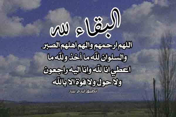 - عظم الله اجركم البقاء والدوام لله وانا لله وانا اليه راجعون الله يرحم فقيدكم نسالكم الدعاء له لله ما اخذ وله ماعطى وكل شيء عنده بمقدار ولا نقول الا ما يرضى ربنا الحمد لله اللهم اجرنى في مصيبتي واخلفنى خيرا منها عظم الله اجركم.