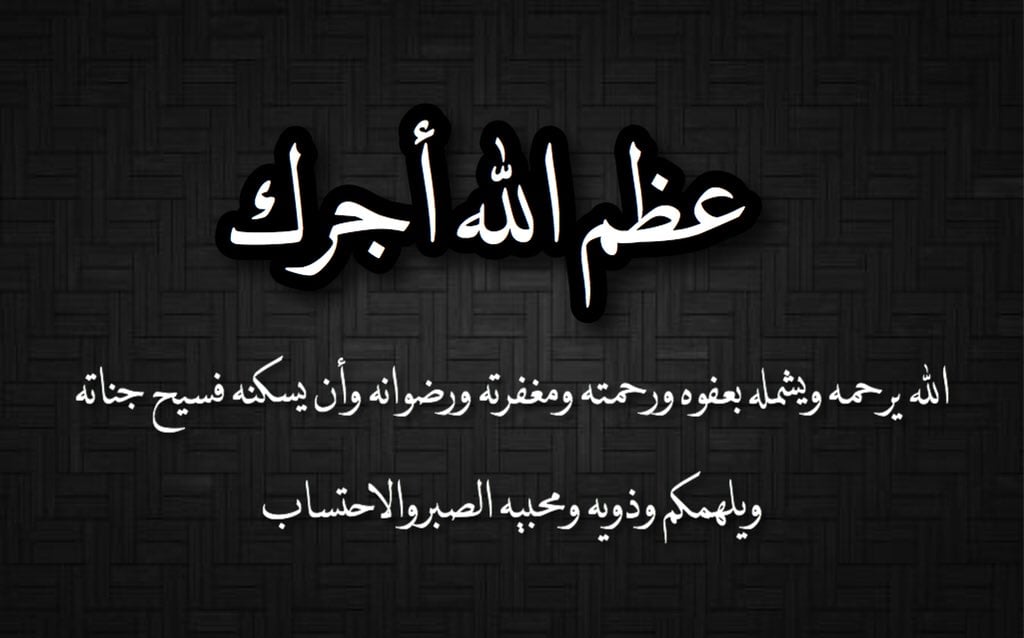 - إنا لله وإنا اليه راجعون ولا حول ولا قوة الا بالله عظم الله أجركم وأحسن الله عزاءكم وغفر لميتكم وجبر الله مصابكم وإن لله ما أخذ وله ما أعطى وكل شيء عنده بأجل مسمى اللهم اغفر له وارفع درجته مع المهديين وافسح له في قبره ونور له فيه برحمتك يا أرحم الراحمين.