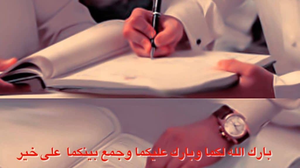 - العبارات تنمق بعقود من ورود، وكل قلب صار يخفق بدعاء في السجود، ربي وفّق وبارك بالآتي والموجود، ألف مبروك عقد القران.