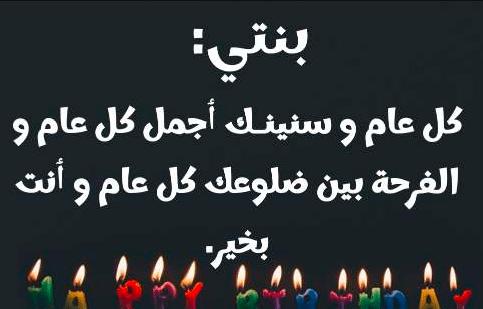 - عيد ميلاد بنتي حبيبتي “الاسم” اليوم تلامس اطرافها سنة جديدة من عمرها تزيد من ايامها يارب اكتب لها الخير والسعادة في ايامها القادمة اليوم اجمل الايام واروع الليالي اليوم غنت الساعات ورقصت الثواني اليوم عيد ميلاد ريحانة قلبي كل سنة وانتي منوره دنيتي وعقبال سنين كثيرة جنبي، عيد ميلاد أغلى البشر، حبيبة قلبي كبرت سنة والله لايحرمني منك كل عام وانتي بألف هنا وصحه وسعاده وفرح وربنا يقدرني واحقق لك كل ماتتمني واشوفك بأعلى المراتب ياروحي يا احلي سما في دنيتي.