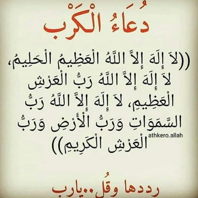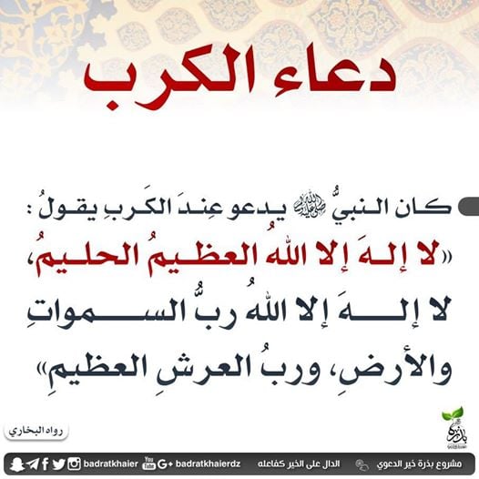 - إنَّ نَبِيَّ اللهِ صَلَّى اللَّهُ عليه وَسَلَّمَ كانَ يقولُ عِنْدَ الكَرْبِ: لا إلَهَ إلَّا اللَّهُ العَظِيمُ الحَلِيمُ، لا إلَهَ إلَّا اللَّهُ رَبُّ العَرْشِ العَظِيمِ، لا إلَهَ إلَّا اللَّهُ رَبُّ السَّمَوَاتِ وَرَبُّ الأرْضِ وَرَبُّ العَرْشِ الكَرِيمِ، وفي رواية : أنَّ رَسولَ اللهِ صَلَّى اللَّهُ عليه وَسَلَّمَ، كانَ يَدْعُو بهِنَّ ويقولُهُنَّ عِنْدَ الكَرْبِ، فَذَكَرَ بمِثْلِ حَديثِ مُعَاذِ بنِ هِشَامٍ، عن أَبِيهِ، عن قَتَادَةَ، غيرَ أنَّهُ قالَ: رَبُّ السَّمَوَاتِ وَالأرْضِ، وفي رواية : أنَّ النبيَّ صَلَّى اللَّهُ عليه وَسَلَّمَ كَانَ إذَا حَزَبَهُ أَمْرٌ، قالَ: فَذَكَرَ بمِثْلِ حَديثِ مُعَاذٍ، عن أَبِيهِ، وَزَادَ معهُنَّ: لا إلَهَ إلَّا اللَّهُ رَبُّ العَرْشِ الكَرِيمِ [عبدالله بن عباس:صحيح]، وسنتناول في هذا المقال العديد من الأدعية الأخرى، آملين الله النجاة من هذا الكرب.