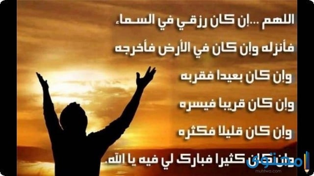 - اللهم إن كان رزقي في السماء فأنزله، وإن كان رزقي في الأرض فأخرجه، وإن كان بعيداً فقربه، وإن كان قريباً فيسّره، وإن كان كثيراً فبارك لي فيه يا أرحم الراحمين، اللهم صل على محمد وعلى آل محمد، واكفني بحلالك عن حرامك، وبطاعتك عن معصيتك، وبفضلك عمن سواك يا إله العالمين.