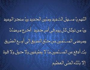 اللهم يا مسهل الشديد، وملين الحديد، ويا منجز الوعيد، ويا من هو كل يوم في أمرٍ جديد، أخرج مرضانا ومرضى المسلمين من حلق الضيق إلى أوسع الطريق، بك ندفع ما لا نُطيق فاللهم ادفع عن المسلمين ما لا يطيقون، واغفر لهم ما لايعلمون، واشفهم شفاءً لا يغادر سقمًا يا رب العالمين ولا حول ولا قوة إلا بالله العليّ العظيم.