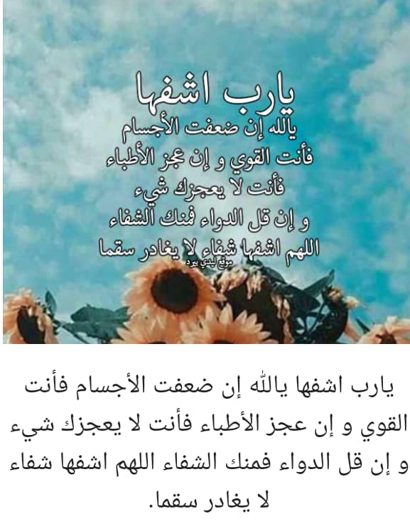 - يارب اغرس في نبضات كل مريض راحه وفي جسده عافية لا تفارقه أبدا اللهم اشفي صديقي ومرضى المسلمين شفاء ليس بعده سقما ابدا.