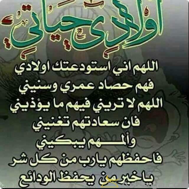 - اللهم إني أستودعك أولادي فهم حصاد عمري وسنيني، فاللهم لا تريني فيهم مايؤديني فإن سعادتهم تغنيني وألمهم يبكيني فاحفضهم يارب من كل شر