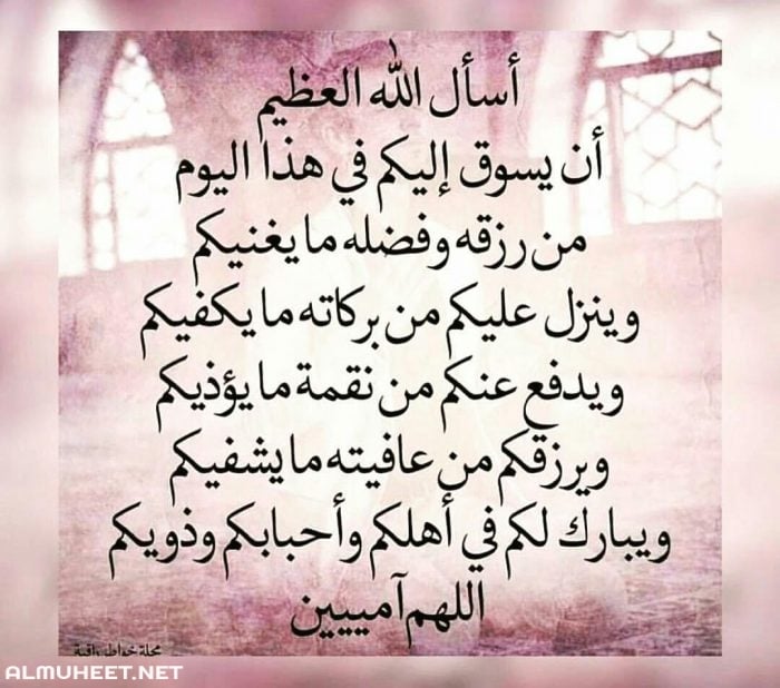 - اللهم إنا نسألك زيادة في الأيمان وبركة في العمر وصحة في الجسد وسعة في الرزق وتوبة قبل الموت وشهادة عند الموت ومغفرة بعد الموت وتحفظ اولادي زوجي وكل احبابي.