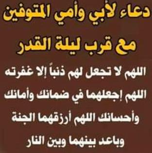 -اللهم أن كانت هذه الليله ليله القدر فلاتحرمنا نورها وبركتها وأجرها وعتقها اللهم وأرحم أمي وأغفر لها حتى لايبقى لها ذنب ووسع مدخلها وأغسلها بالماء والثلج والبرد وطيب مشهدها وأجعل قبرها روضة من رياض الجنة وأسكن براد العافية بجسد أبي وأرضى اللهم عنه حتى يعجز عن شكرك.
