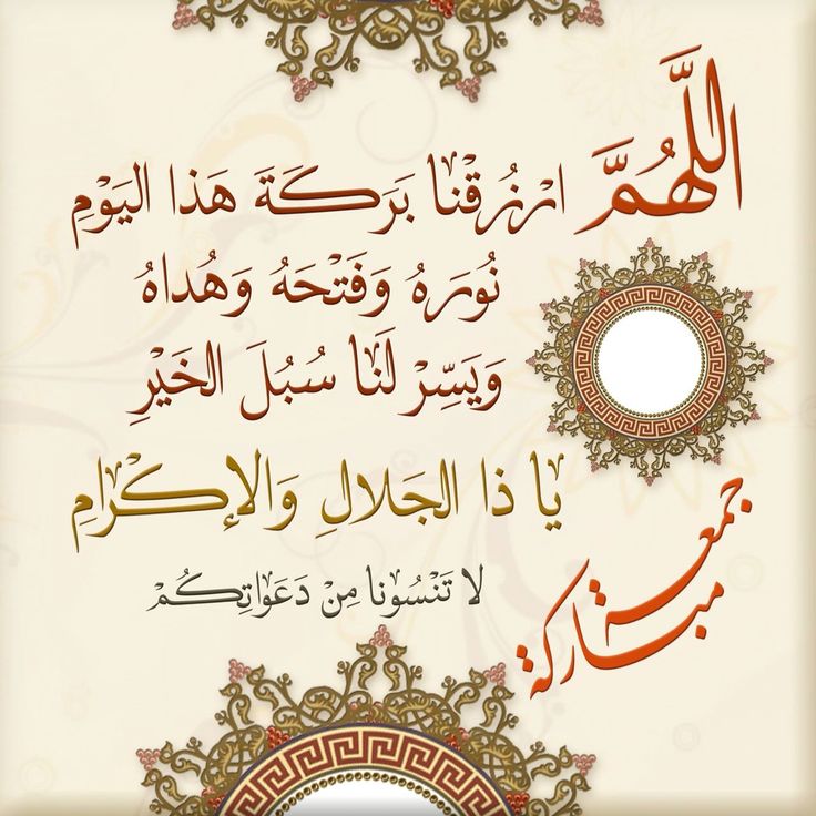 اللهم في يوم الجمعة متعنا براحة البال وصلاح الحال وقبول الأعمال وأنعم علينا بصحة الأبدان واكفنا شر الإنس والجان وأسألك الله م فرجا لكل مهموم وعطاء لكل محروم وشفاء لكل مريض ورحمة لكل ميت ورزقا لكل محتاج واستجابة لكل دعاء .