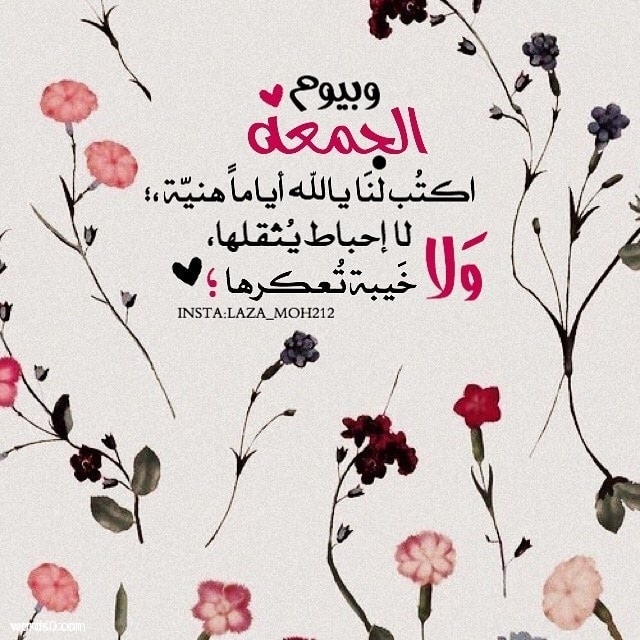 - أسأل الله في يوم الجمعة أن يحبب صالح خلقه فيك، ومن يد نبيه يسقيك، وفي الجنة يؤويك، وبالرحمة يحتويك، وبقضائه يرضيك، وبفضله يغنيك، ولطاعته يهديك، ومن عذابه ينجيك، ومن شر الحساد يكفيك.