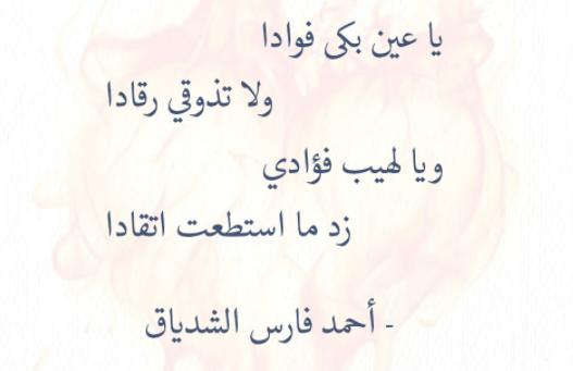 ليت الذي خلق العيون السودا خلق القلوب الخافقات حديدلولا نواعسها و لولا سحرها ما ودّ مالك قلبه لو صيداعوّذ فؤادك من نبال لحاظها أو مت كما شاء الغرام شهيداإن أنت أبصرت الجمال و لم تهم كنت امرءا خشن الطباع ،بليدا وإذا طلبت مع الصبابة لذّة فلقد طلبت الضائع الموجودايا ويح قلبي إنّه في جانبي وأظنّه نائي المزار بعيدا مستوفز شوقاإلى أحبابه المرء يكره أن يعيش وحيداً برأ الإله له الضلوعوقاية وأرته شقوته الضلوع قيودا فإذ هفا برق المنى و هفا لههاجت دفائنه عليه رعودا جشّمته صبرا فلمّا لم يطق جشّمتهالتصويب والتصعيدا لو أستطيع وقيته بطش الهوى ولو استطاعسلا الهوى محمودا هي نظرة عرضت فصارت في الحشا ناراو صار لها الفؤاد وقودا والحبّ صوت، فهو أنّه نائح طوراو آونة يكون نشيدا يهب البواغم صدّاحة فإذا تجنّى أسكتالغرّيدا ما لي أكلّف مهجتي كتم الأسى إن طال عهد الجرحصار صديدا ويلذّ نفسي أن تكون شقيّة ويلذّ قلبي أن يكونعميدا إن كنت تدري ما الغرام فداوني أو لا فخلّ العذلوالتفنيدا يا هند قد أفنى المطال تصبّري وفنيت حتّى ما أخافمزيدا ما هذه البيض التي أبصرتها في لمّتي إلّا اللّيالي السوداما شبت من كبر و لكنّ الذي حمّلت نفسي حمّلته الفودا هذا الذيأبلى الشباب وردّه خلقا وجعّد جبهتي تجعيدا علمت عيني أن تسحّدموعها بالبخل علمت البخيل الجودا ومنعت قلبي أن يقرّ قرارهولقد يكون على الخطوب جليدا دلّهتني و حميت جفني غمضهلا يستطاع مع الهموم هجودا لا تعجبي أنّ الكواكب سهّدفأنا الذي علّنتها التسهيدا أسمعتها وصف الصبابه فانثنت وكأنّما وطيء الحفاة صرو