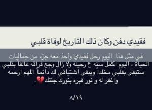 - اجمل ذكري ذكرياتي كلها راحت مع أبي انتهت فرحه سنيني انتهى كل شي فيني بعد وفاه “الاسم”، لا أستطيع أن اوصف لكم الشعور في وفاه “الاسم” فقد كانت فاجعه للجميع، فيارب أجعل مثواه الجنة واغفر يارب سيئاته فأنت أرحم الراحمين.