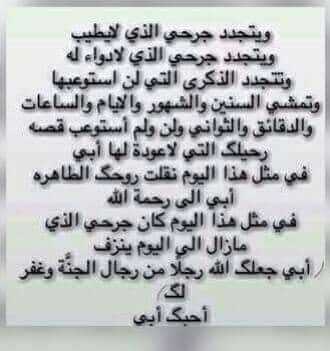 - أخبرك يا أبي منذ مُت وأنا حزين ولا أستطيع بذكرى وفاتك إلا أن غيابك كسرني، ربي ارحم أبي واجعل الجنة مقامه في حنة الفردوس.