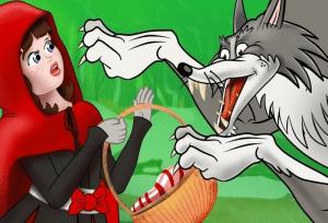 - وفجأة سمعت أصوات غريبة قادمة من خلف الأشجار ، وإذ به ذئب كبير الحجم يقفز أمامها ، فارتعدت الفتاة الصغيرة وخافت كثيرًا لرؤيتها الذئب ، فسقطت السلة من يدها على الأرض ، فهجم الذئب على السلة ، وبدأ يجمع الكعك الذي ينتثر على الأرض .