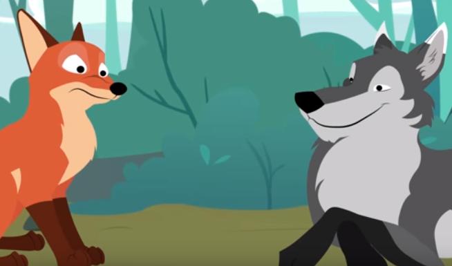 تشجع الذئب عندما أخبره الثعلب أن الحيوان غبي وودود. فذهب إليه وسأله عن اسمه: – مرحبا ما اسمك أيها الغريب؟