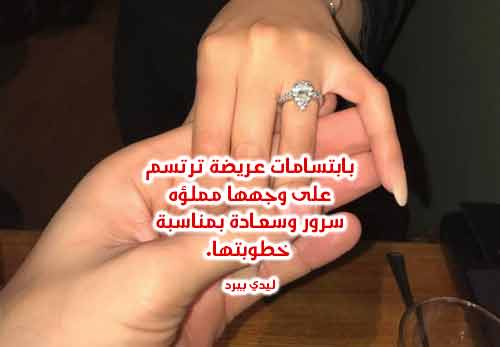 - يا طيور المحبة زوريها وعن فرحتي لها خبريها وقوليلها مبروك الخطوبة عليها. كلمة مبروك ما تكفي وكل المعاني ما توفي أعبر لكي عن مدى هناي بخطوبتك يا غالية.