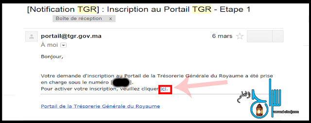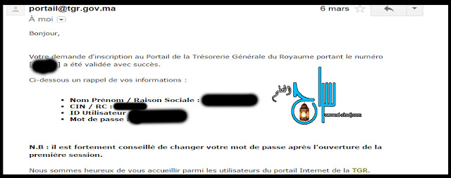 - ثم رسالة إلكترونية ثانية تتضمن معلومات التسجيل، احتفظ بها في حالة نسيان معلومات ولوج موقع الخزينة العامة للمملكة.