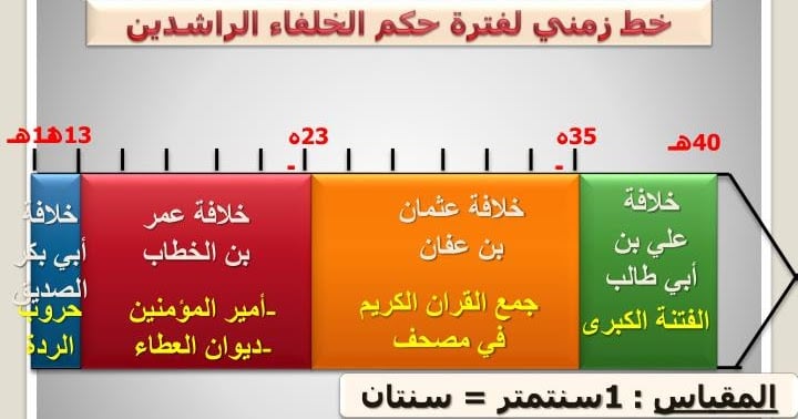 - أبو بكر الصديق: حكم من عام 632م إلى عام 634م، بعد وفاة الرسول محمد عليه الصلاة والسلام، حيث بايعه المسلمون في سقيفة بني ساعدة، ومن أهم أعماله أثناء توليه الخلافة: محاربة المرتدين عن الإسلام فشارك في حروب الردة، وإرسال جيش أسامة بن زيد لمقاتلة الروم، وجمع القرآن بعد قتل الكثير من حفظة القرآن، والفتوحات الإسلامية في العراق وبلاد الشام.