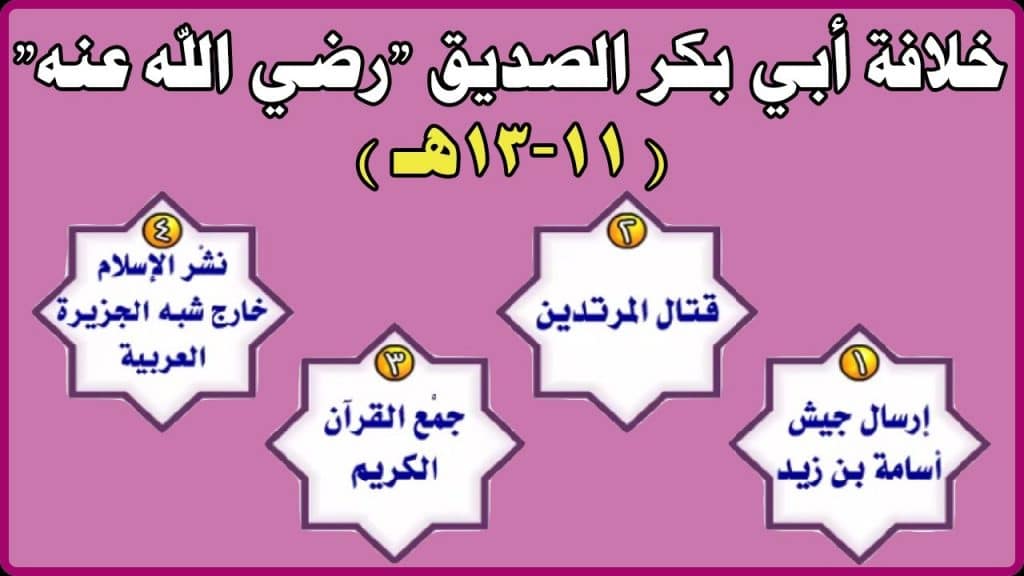 - أبو بكر الصديق جمع القرآن الكريم ضمن كتاب واحد وذلك من خلال لجنة لتجميع كل الايات القرانيه يرأسها زيد بن ثابت ، ازدادت البقعة الاسلامية وانتشرت الفتوحات خلال فترة حكمه وكان من ضمن تلك الفتوحات بلاد الشام والعراق. حافظ على الوحدة الإسلامية. قاد حروب الردة وهزم القبائل التي ارتدت عن دين الله بعد وفاة رسوله الكريم. قوي وعزز القبضة الإسلامية المنتشرة على ساحل البحر الأحمر. قاد بعض الحملات الناجحة ضد البيزنطيين والامبراطورية الفارسية.
