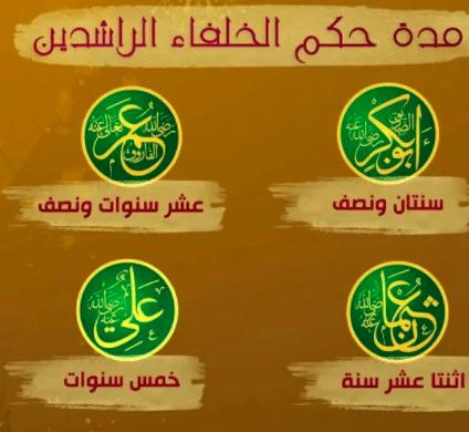 استمر حكم الخلفاء الراشدين مدة ثلاثون عاماً، وذلك من العام 632 حتى العام 661 ، و مدة حكم كل الخلفاء الراشدين هي كالتالي :